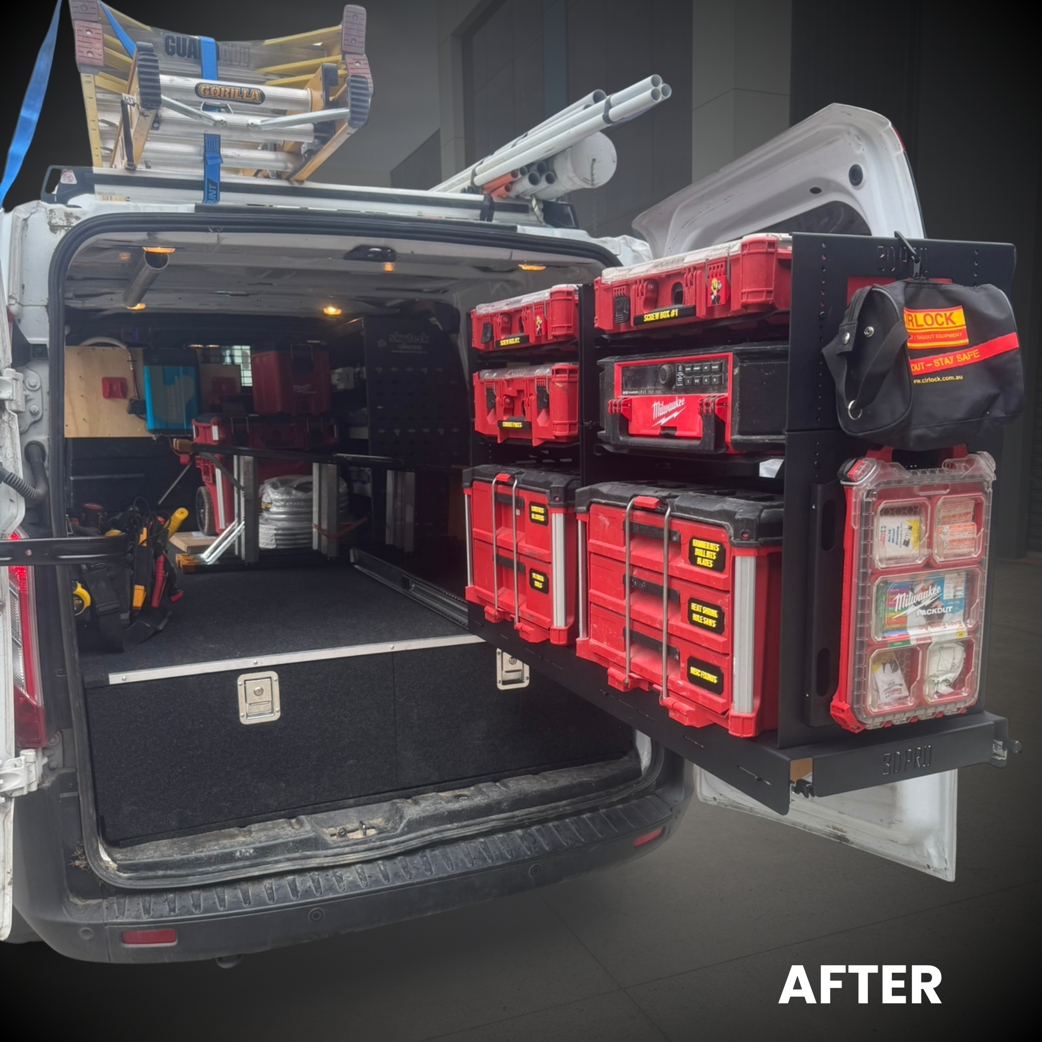 Our Dual Slider is the perfect solution for vehicles who like to utilise our slide out system with their Milwaukee Packout boxes. As the name suggests the 2.0 Dual Slider has cut outs designed to suit 2x full width packout box or 4 x half width packout box.